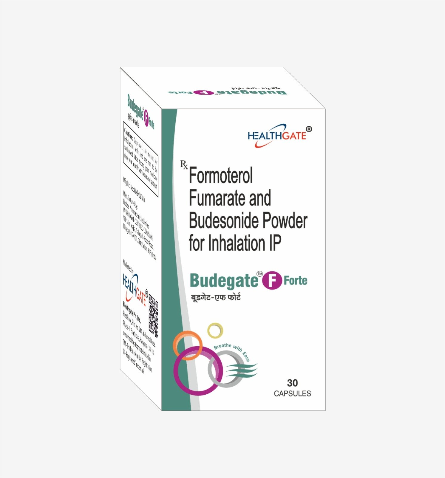 Budegate F Forte is a prescription medication for inhalation, presented in dry powder capsule form. It is marketed by Healthgate. The formulation is contained within hard capsules that are specifically designed for use with a compatible dry powder inhaler device (e.g., a Rotahaler or Revolizer). The packaging contains 30 capsules.