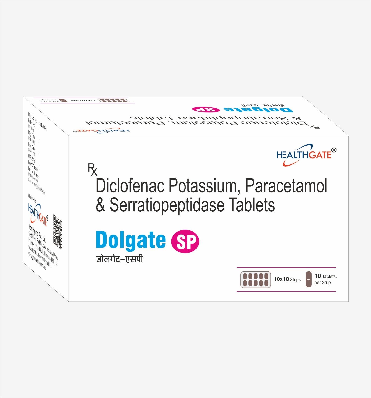 Dolgate-SP is a combination medication marketed by Healthgate. It combines three active ingredients to provide powerful relief from pain and inflammation. Diclofenac Potassium is an NSAID that reduces pain and swelling. Paracetamol acts as a pain reliever and fever reducer. Serratiopeptidase is an enzyme that helps break down abnormal proteins at the site of inflammation, accelerating the healing process. This combination is typically used for severe pain and inflammatory conditions, such as post-operative pain, injury-related swelling, and various joint or muscle disorders.
