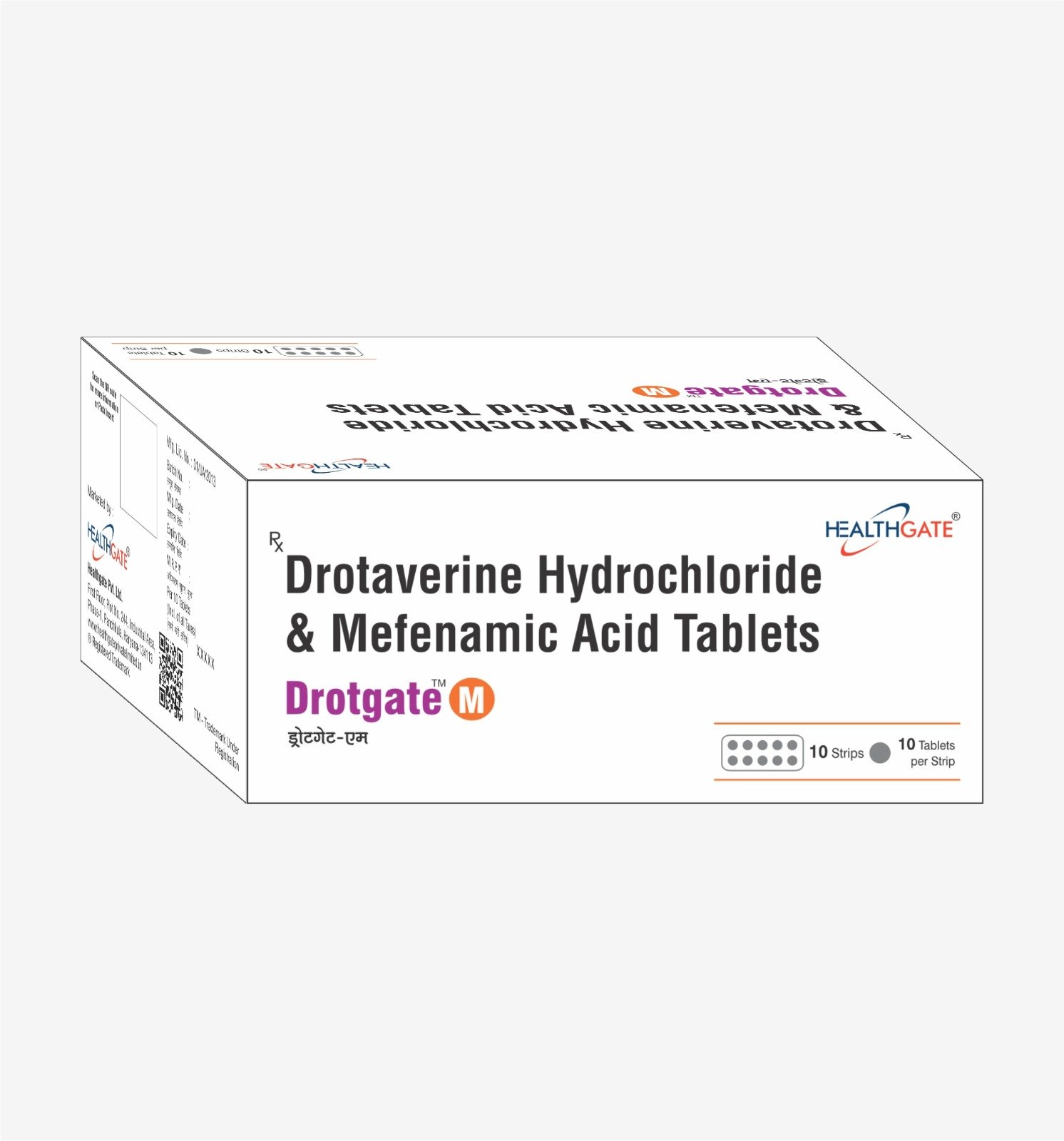 The box for Drotgate M specifies two main active pharmaceutical ingredients: