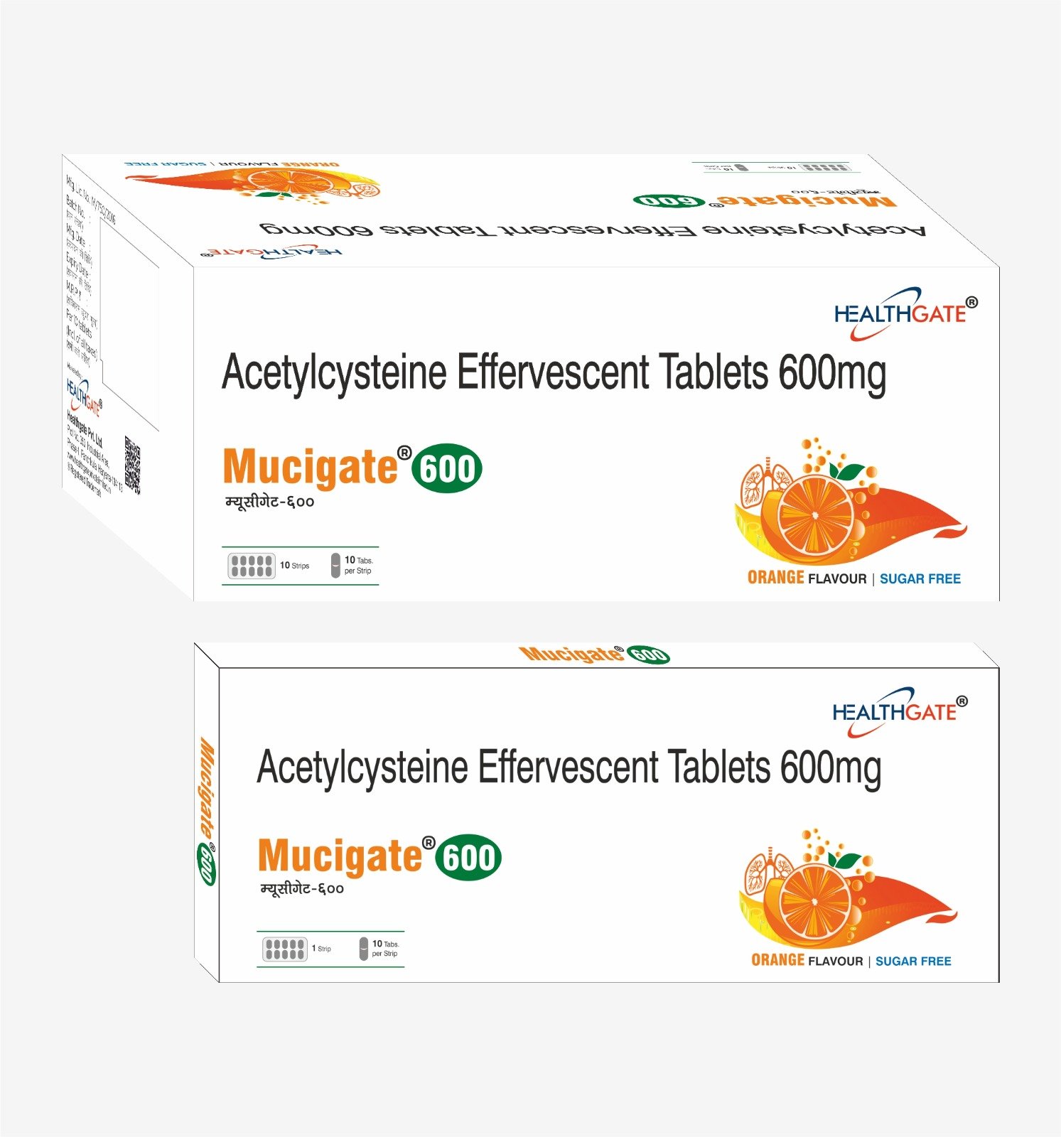 Mucigate 600 is an effervescent tablet formulation of Acetylcysteine, designed to treat respiratory conditions characterized by the production of thick, viscous mucus that is difficult to cough up. By thinning and reducing the stickiness of this mucus, it makes it easier for the body to clear the airways through coughing, thereby improving breathing and airflow in patients with conditions like acute or chronic bronchitis, COPD, or cystic fibrosis.